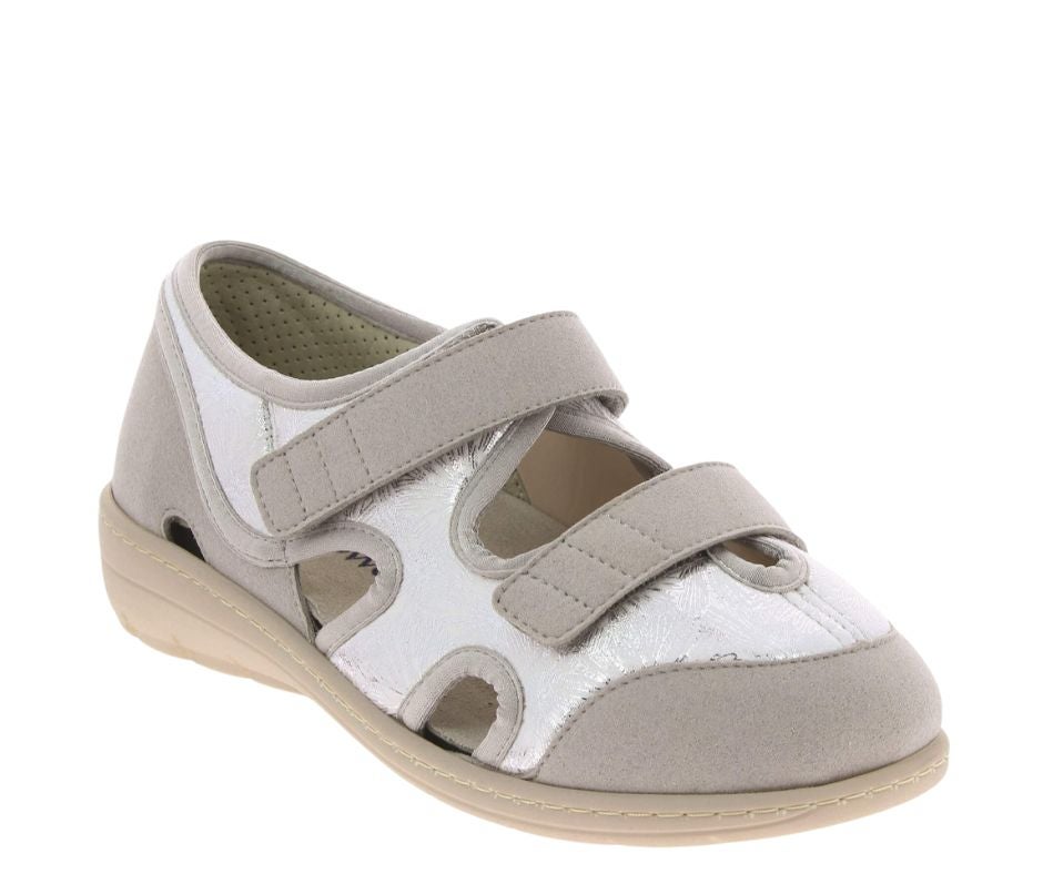 Stretch-materiaalista valmistettu harmaa päällinen mukautuu jalkojen muotoihin ja tarjoaa miellyttävän käyttökokemuksen myös ongelmajaloille, kuten vaivaisenluulle tai vasaravarpaalle. Tyylikäs hopeanhohtoinen kuviointi tuo ilmettä kenkiin.
