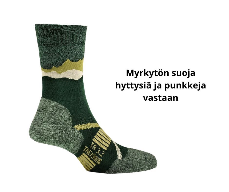 Sukat on käsitelty myrkyttömällä ja ympäristöystävällisellä karkotteella, joka torjuu hyttyset ja punkit jopa 40 senttimetrin säteellä. Käsittely on hajuton, ihoystävällinen ja hypoallerginen, eikä se sisällä DEET:iä tai permetriiniä. Se on turvallinen sekä lapsille että raskaana oleville, WHO:n suositusten mukaisesti. Teho säilyy vähintään 100 pesukertaa. Hajuste, jota hyönteiset luonnostaan väistävät, on vaaraton niin ihmisille, eläimille kuin ympäristölle – myös vesieliöille ja kaloille. P.A.C. Trekking punkkisukat tarjoavat huolettoman ja kestävän ratkaisun ulkoiluun ilman hyönteishaittoja.